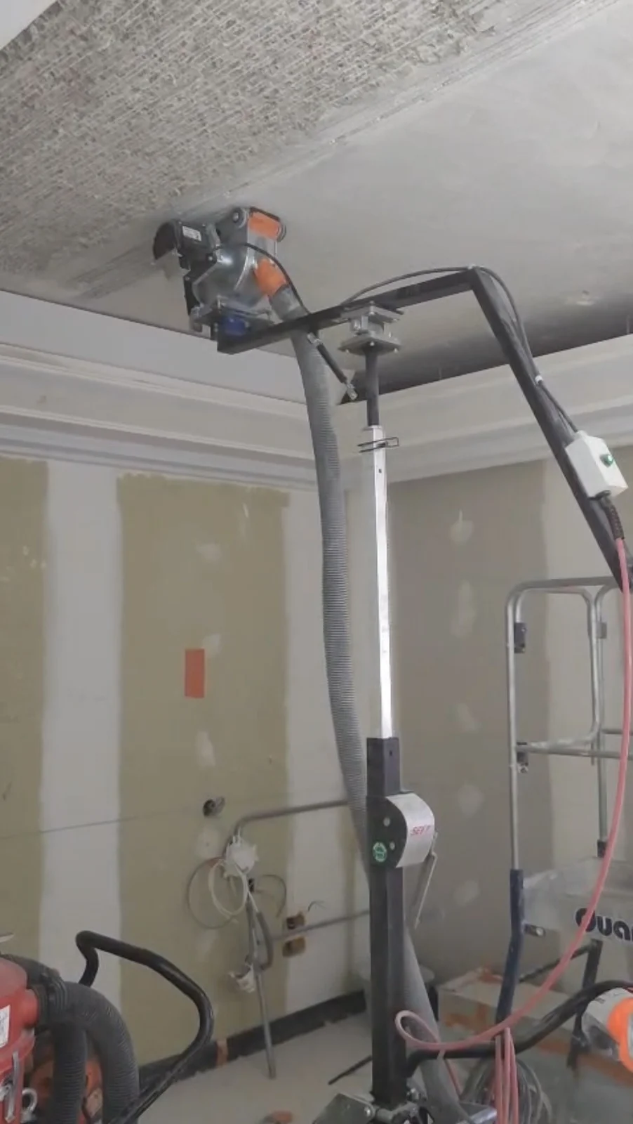 Desman RAI102822 monté sur bras articulé avec chariot Eland pour absorber la masse. Rainurage plafond en sécurité et sans pénibilité pour réseaux électriques et CVC suspendus.